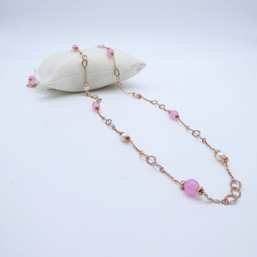 Collana lunga Perle, Agata rosa e catena mix PE 476