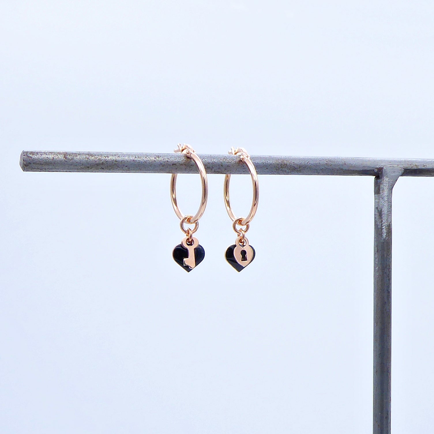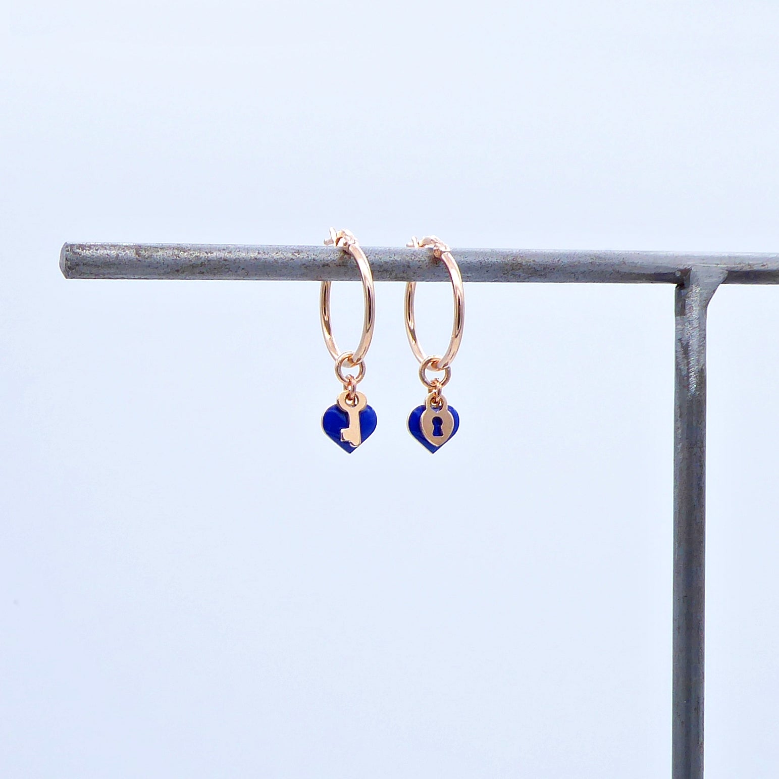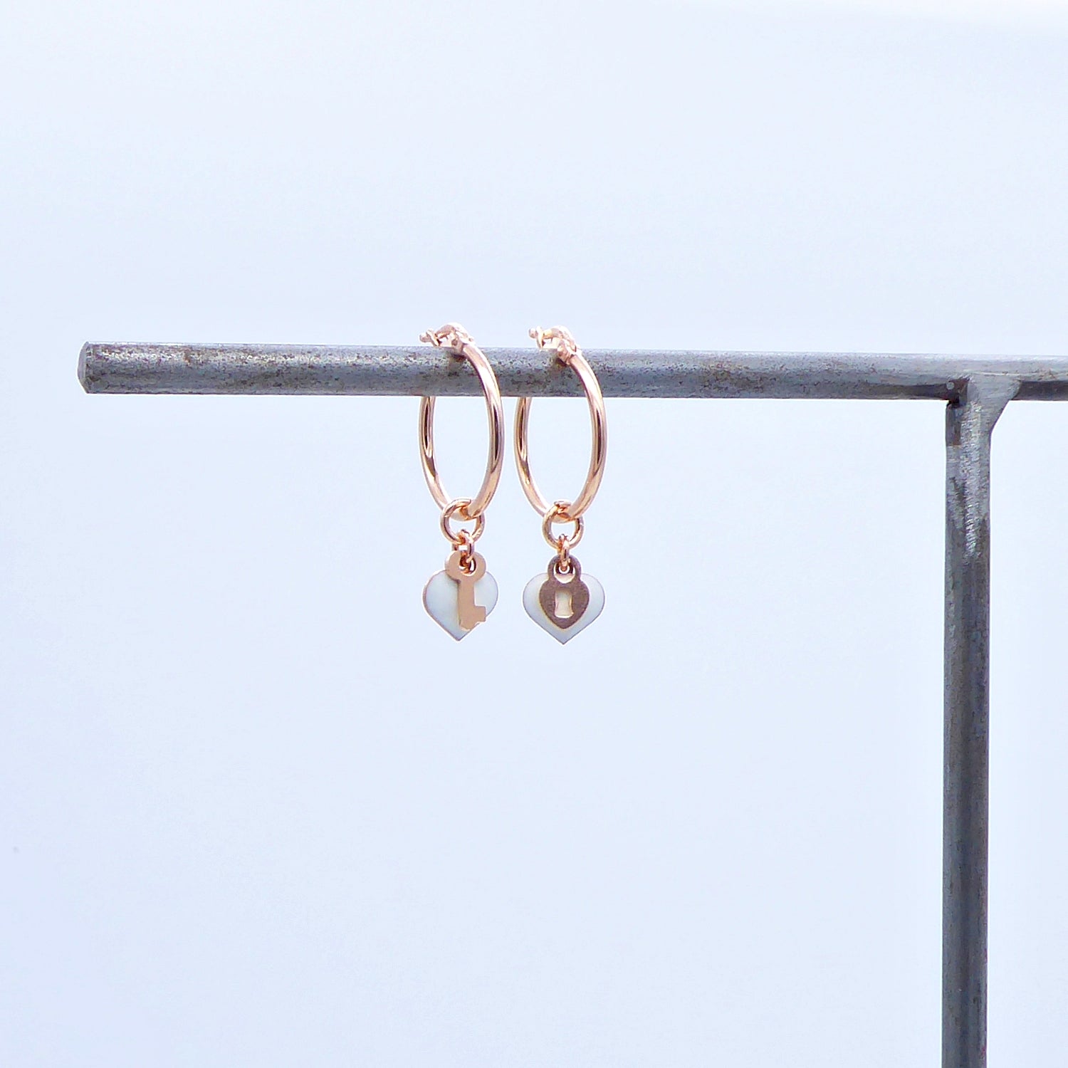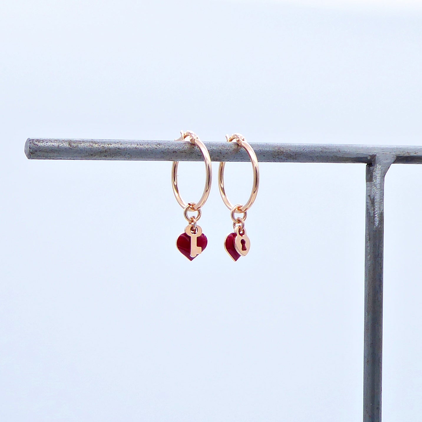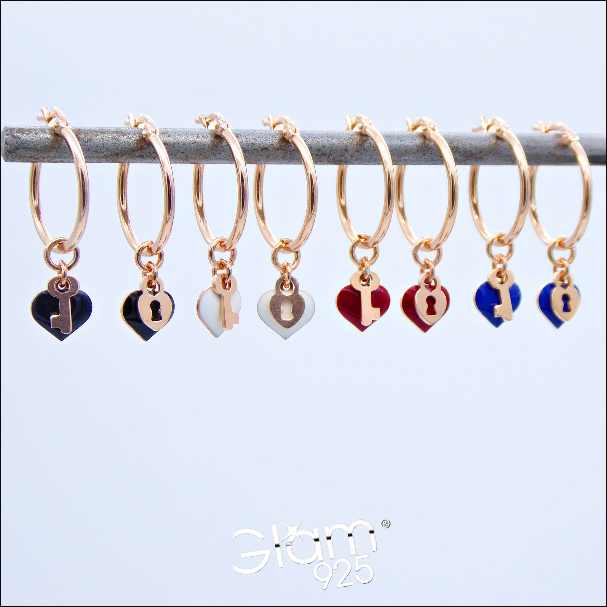 Orecchini a baionetta sdoppiati con ciondoli cuore smalto e chiave lucchetto in argento Ref. O 453