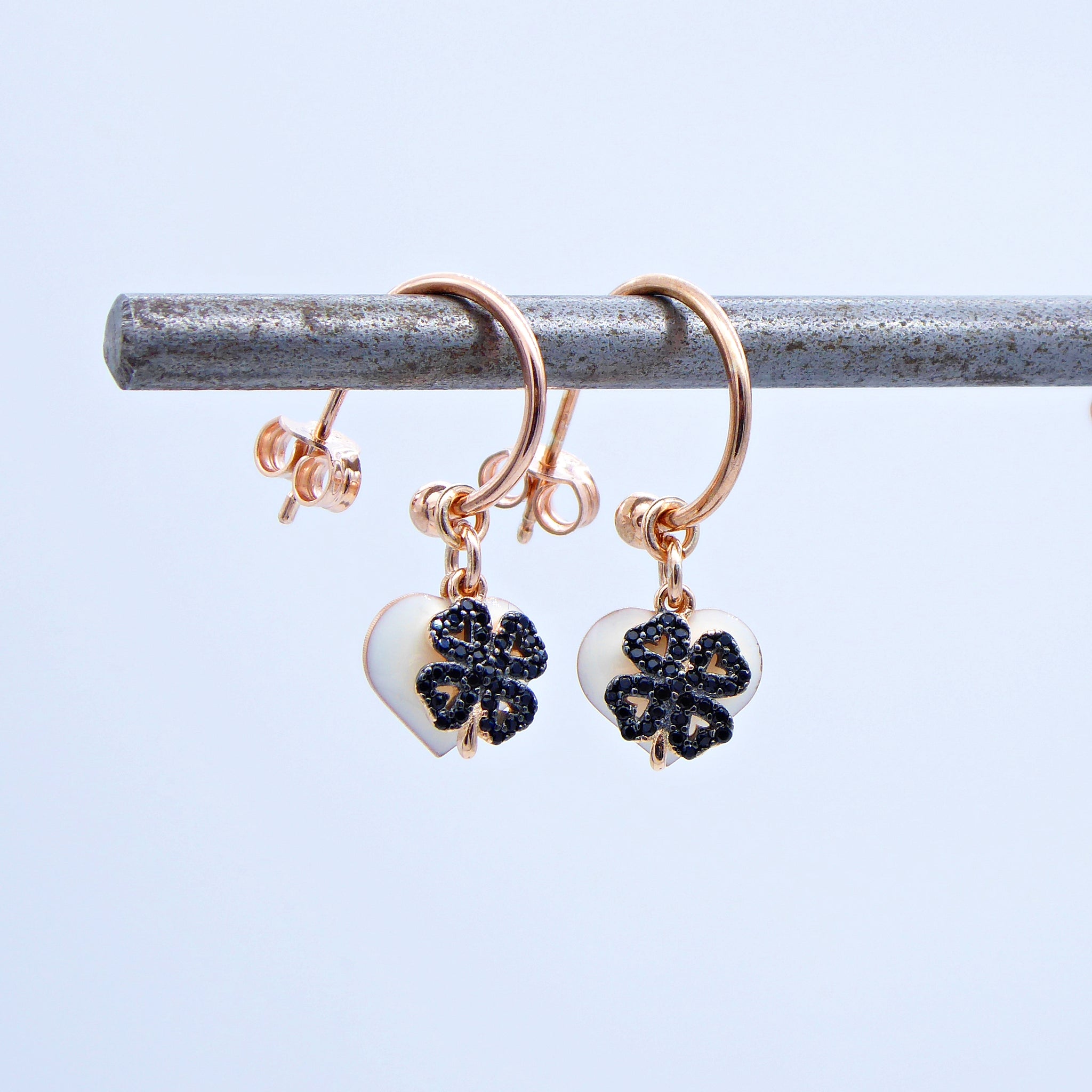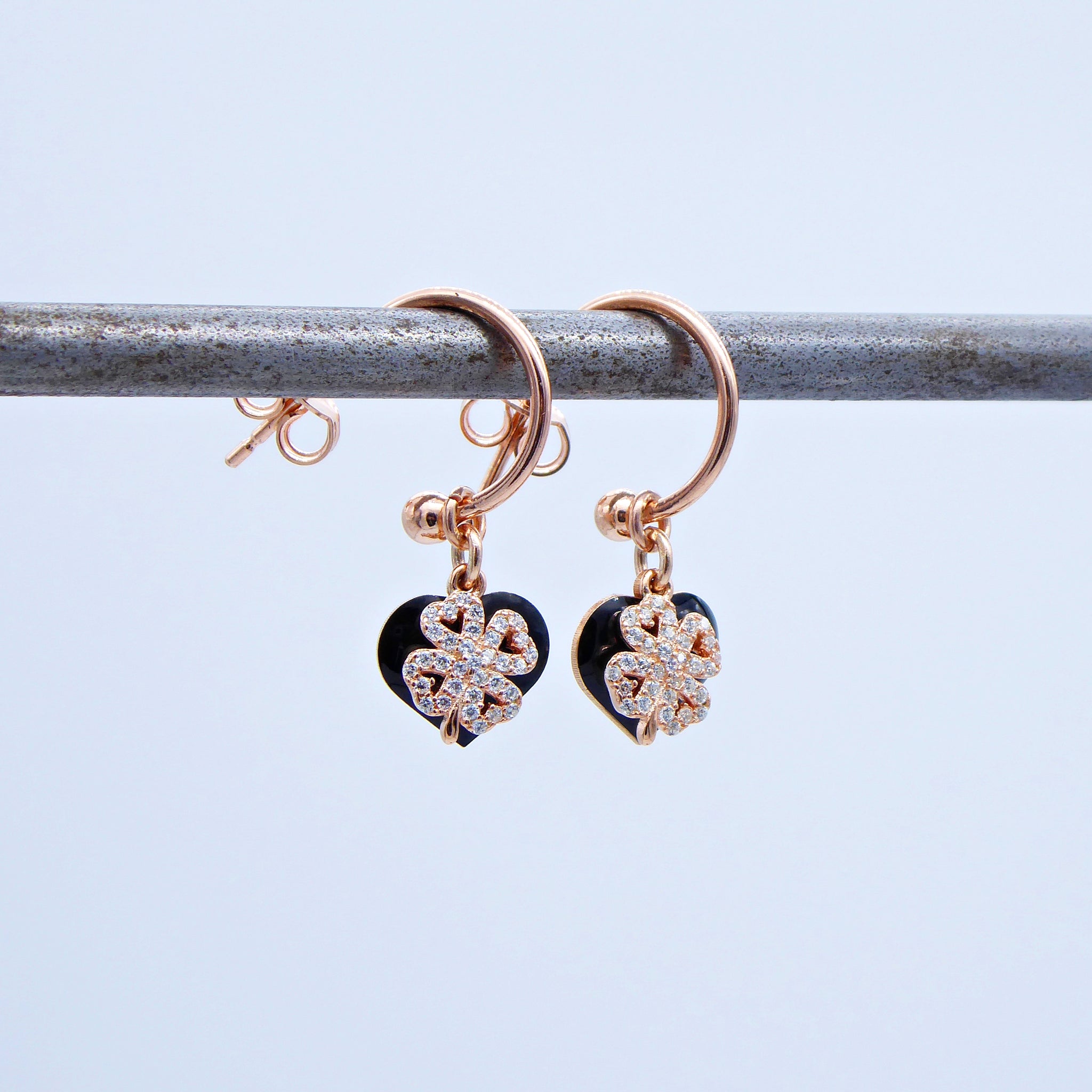 Cuore smalto nero quadrifoglio zirconi bianchi